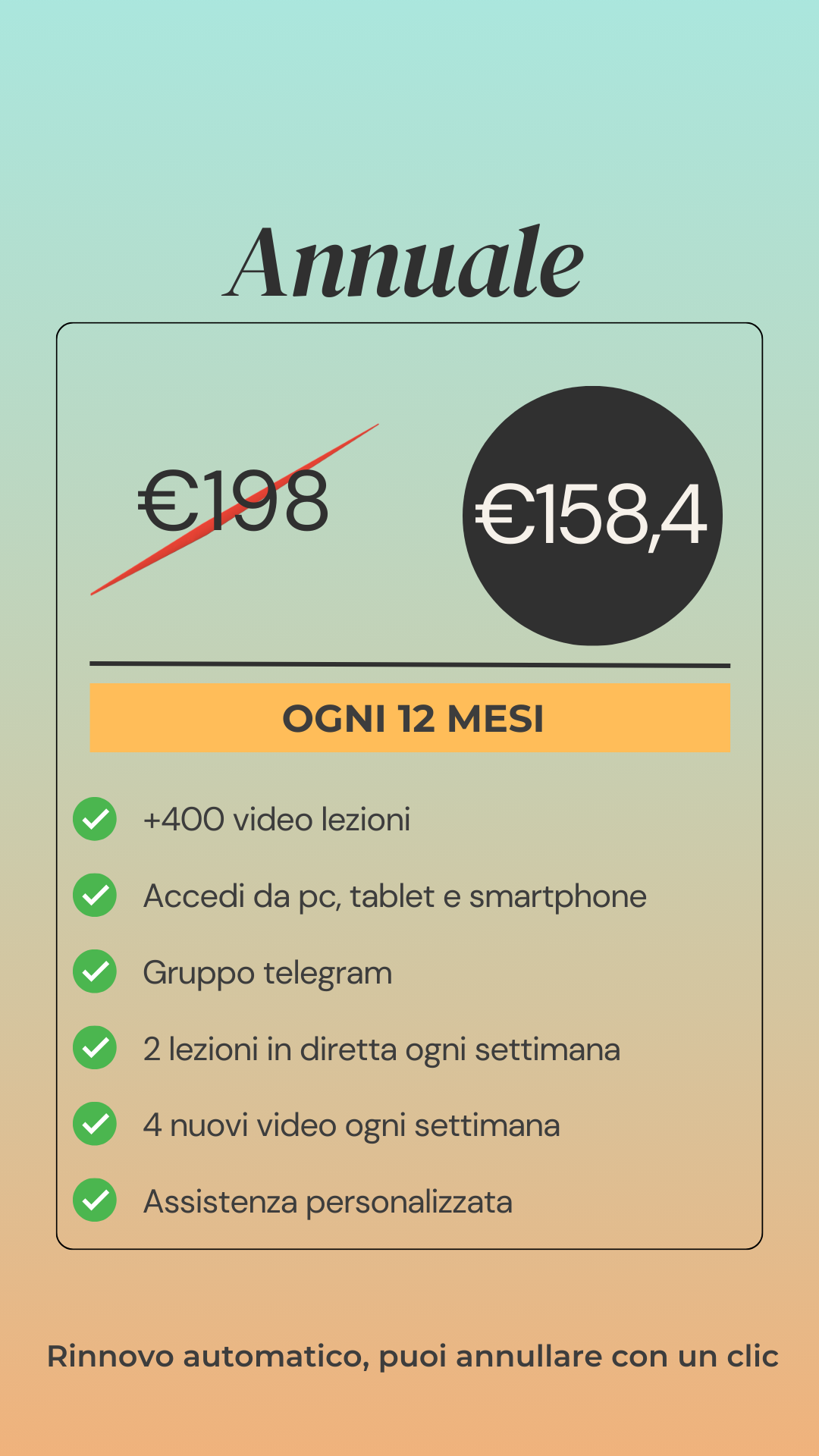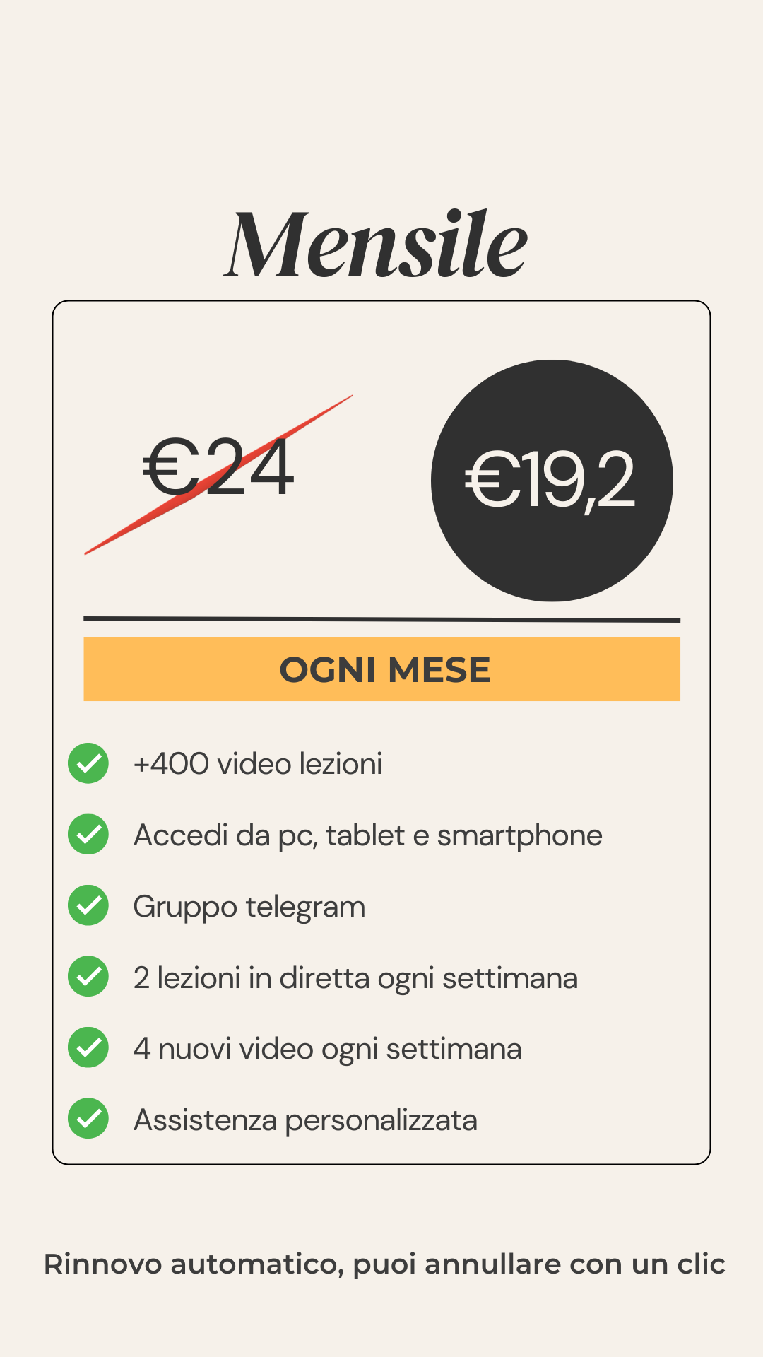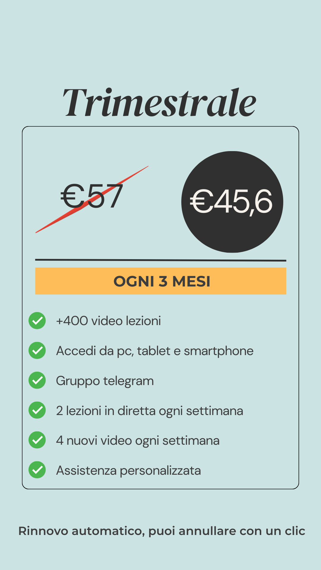 Ogni abbonamento si rinnova in automatico, ma sarai sempre libero di interromperlo o modificarlo quando vorrai. Puoi controllare la data di rinnovo del tuo abbonamento sul profilo utente in 'Gestione iscrizioni' o semplicemente contattarmi direttamente.